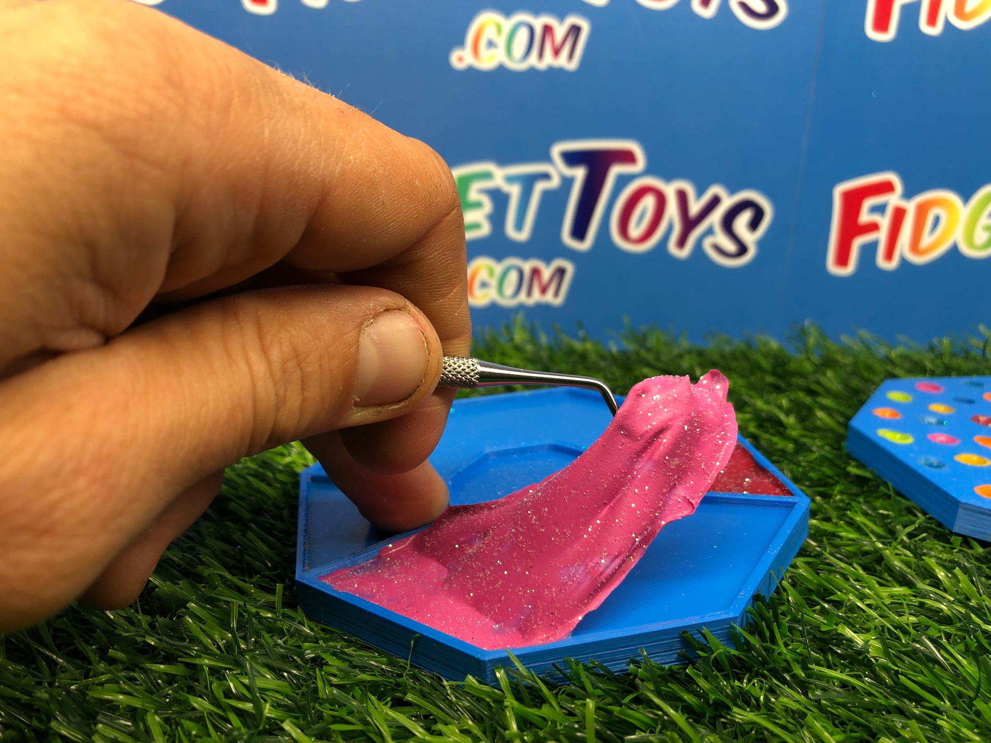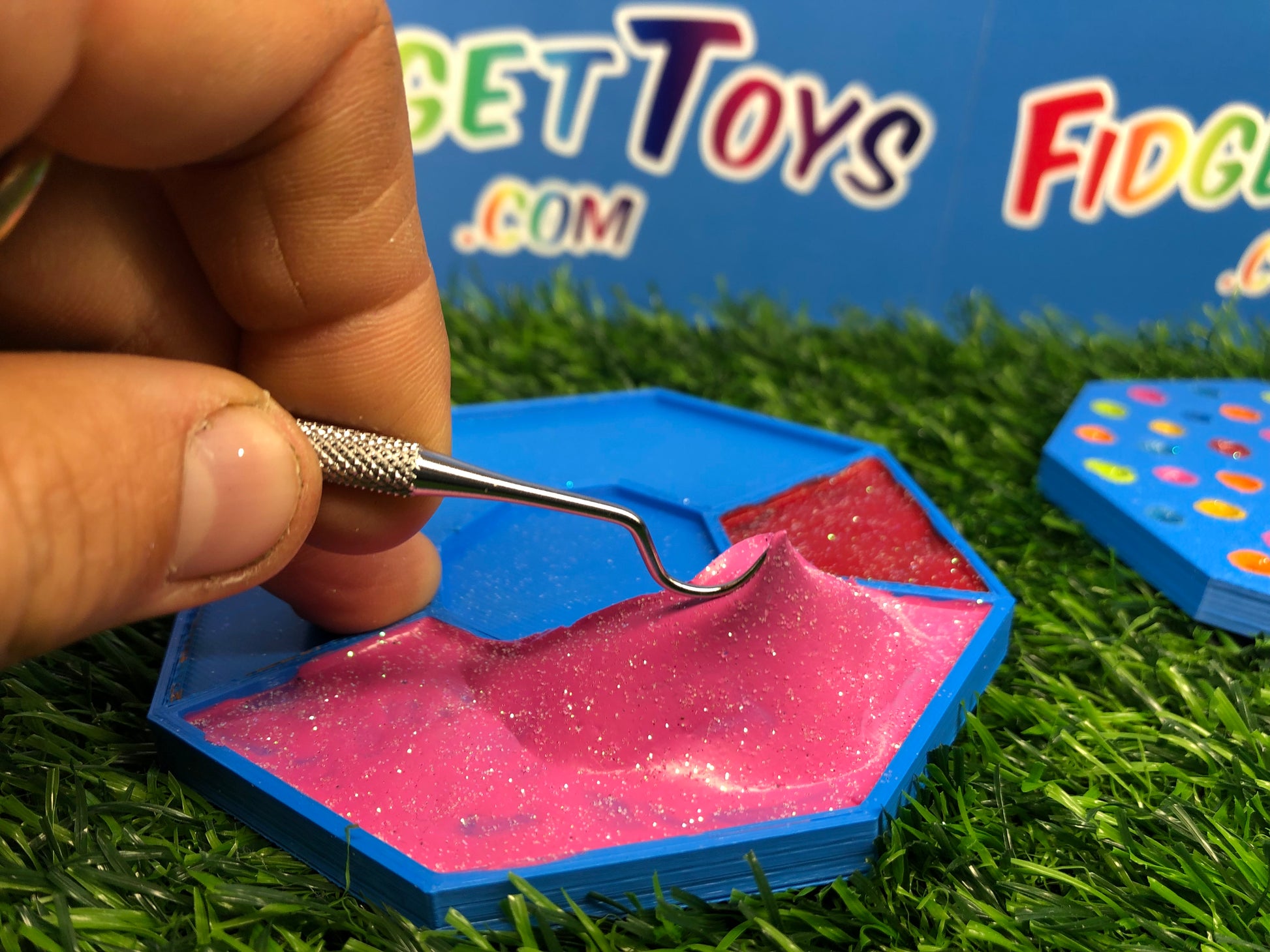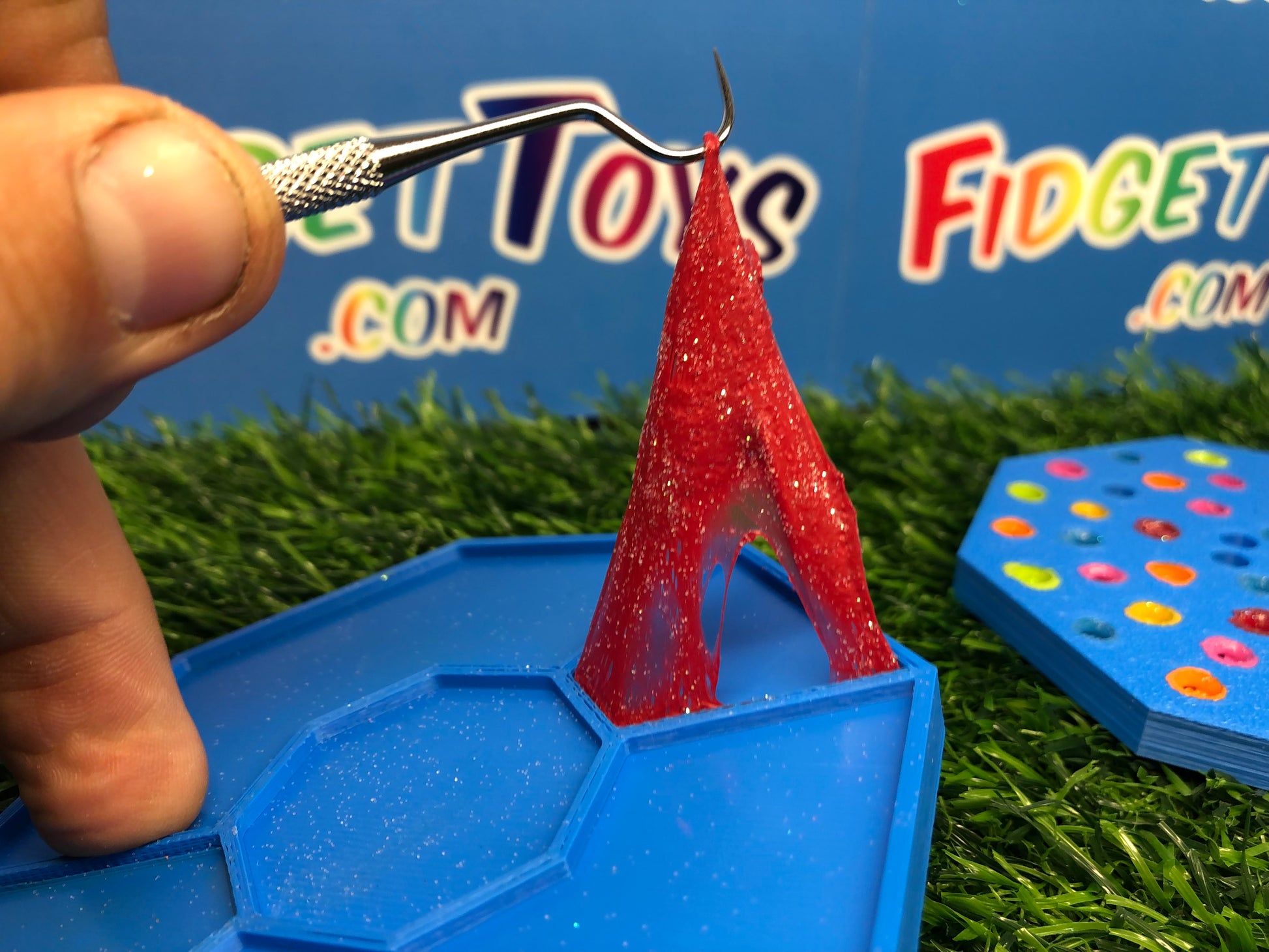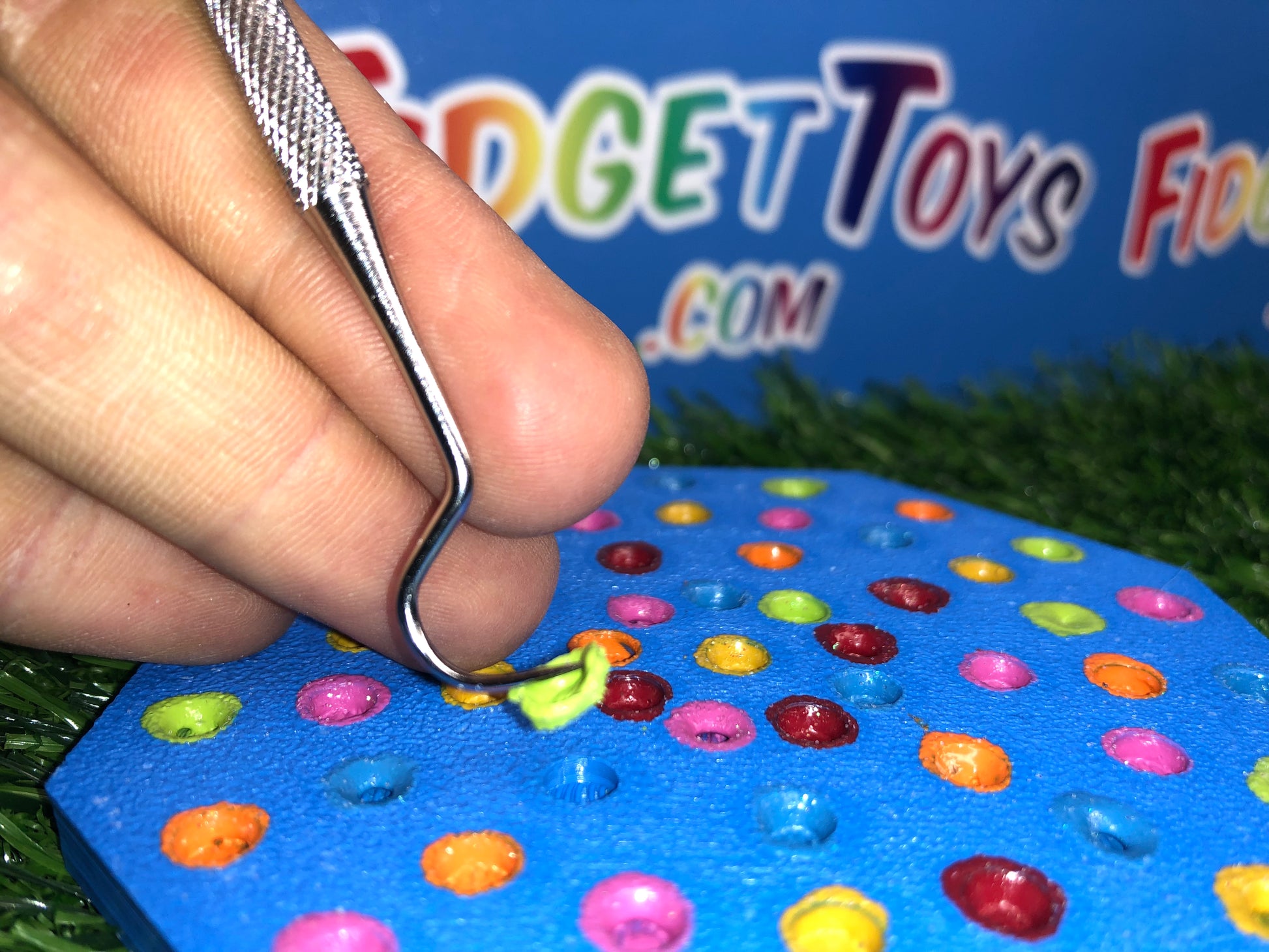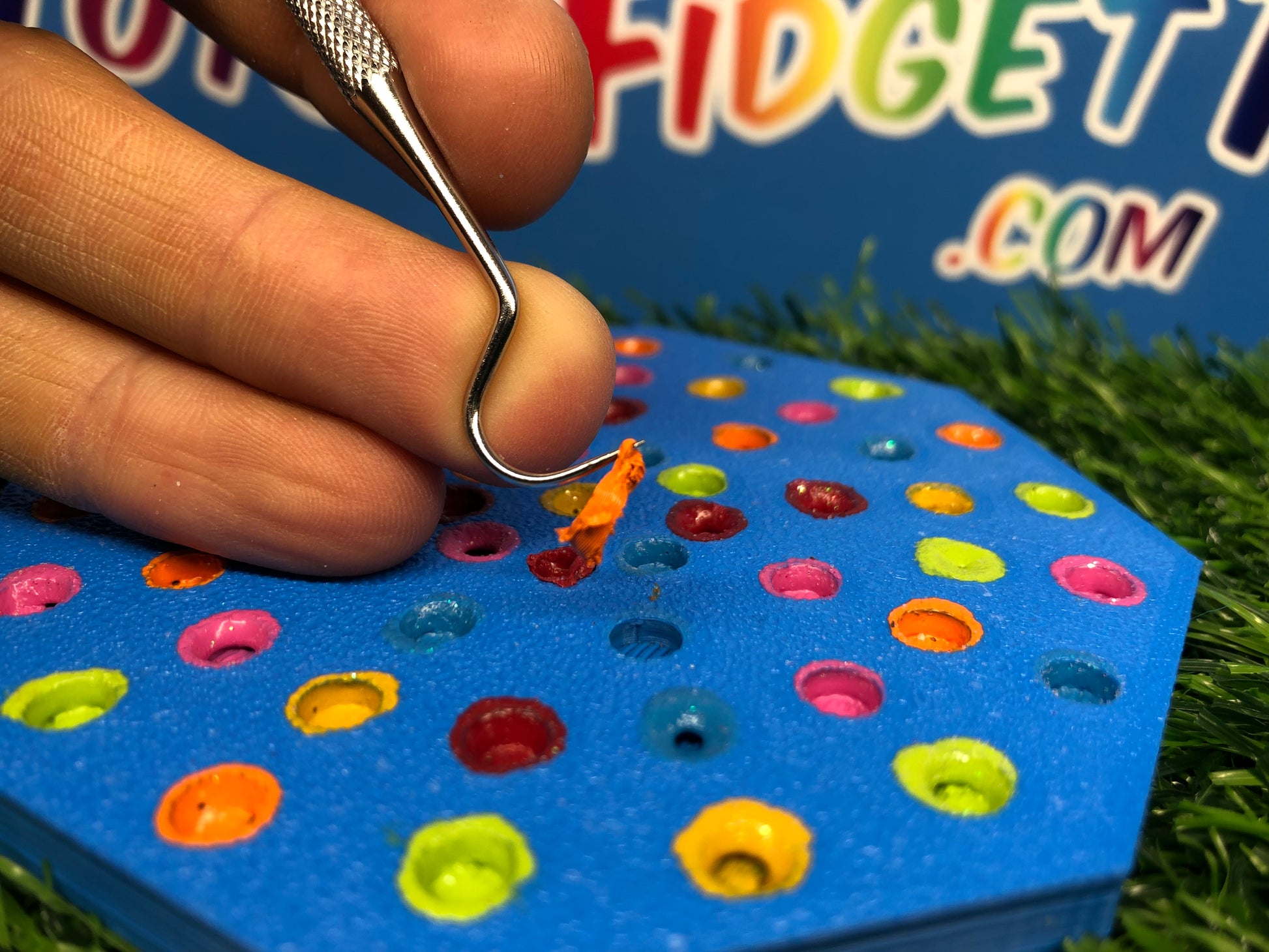 Featuring two sides for picking and peeling, the colored resin mimics stretchy rubber as you work your magic with the custom pallet. It's a tactile experience that not only relieves stress but also transports you back to the times when picking glue off your hands was the highlight of your day.