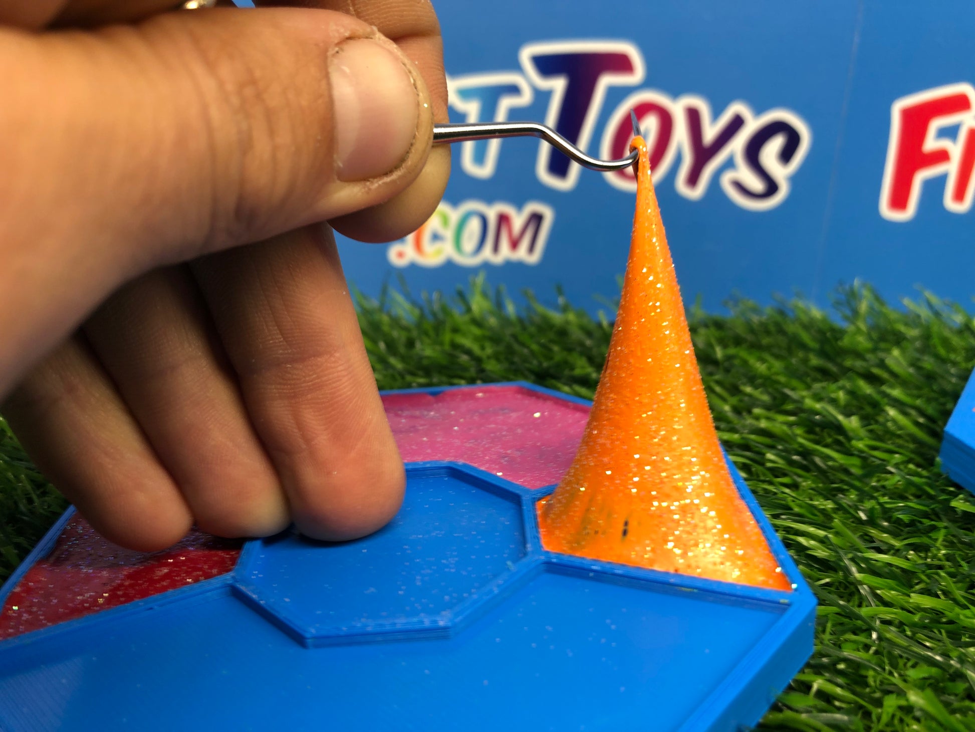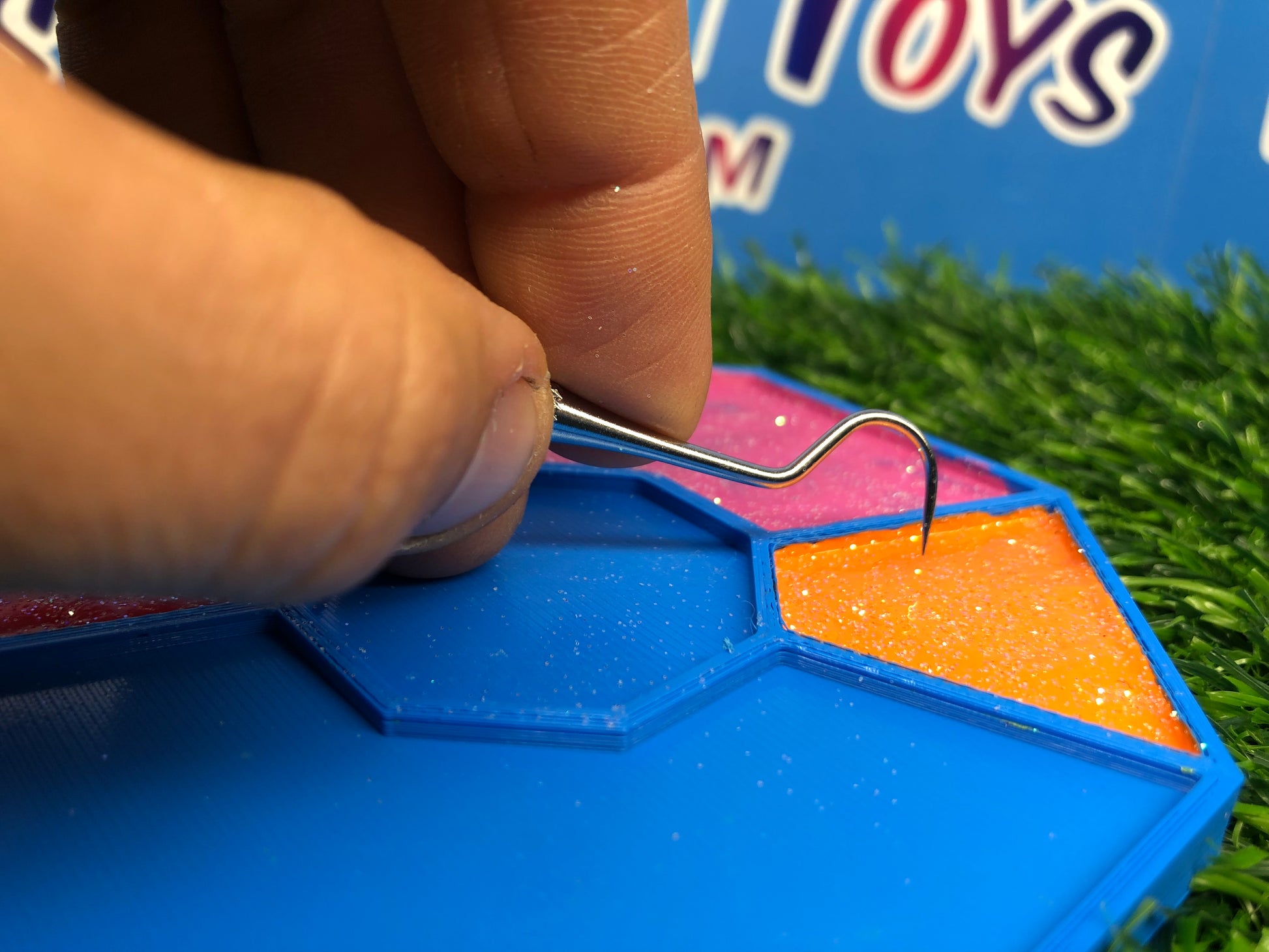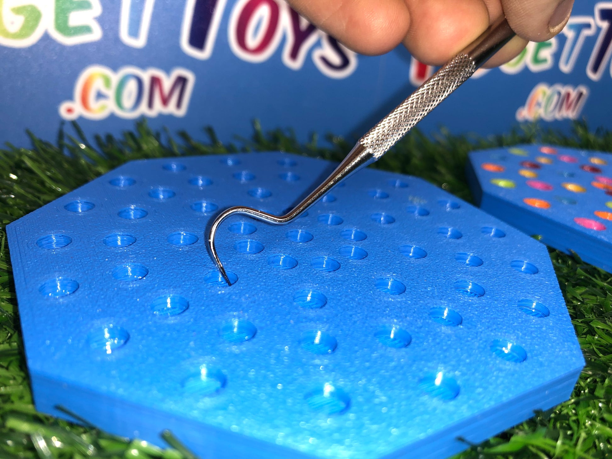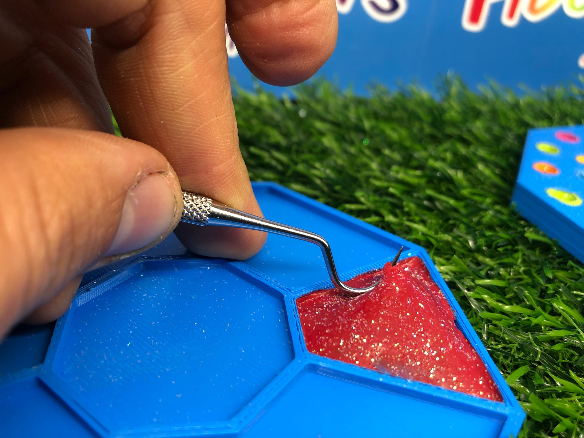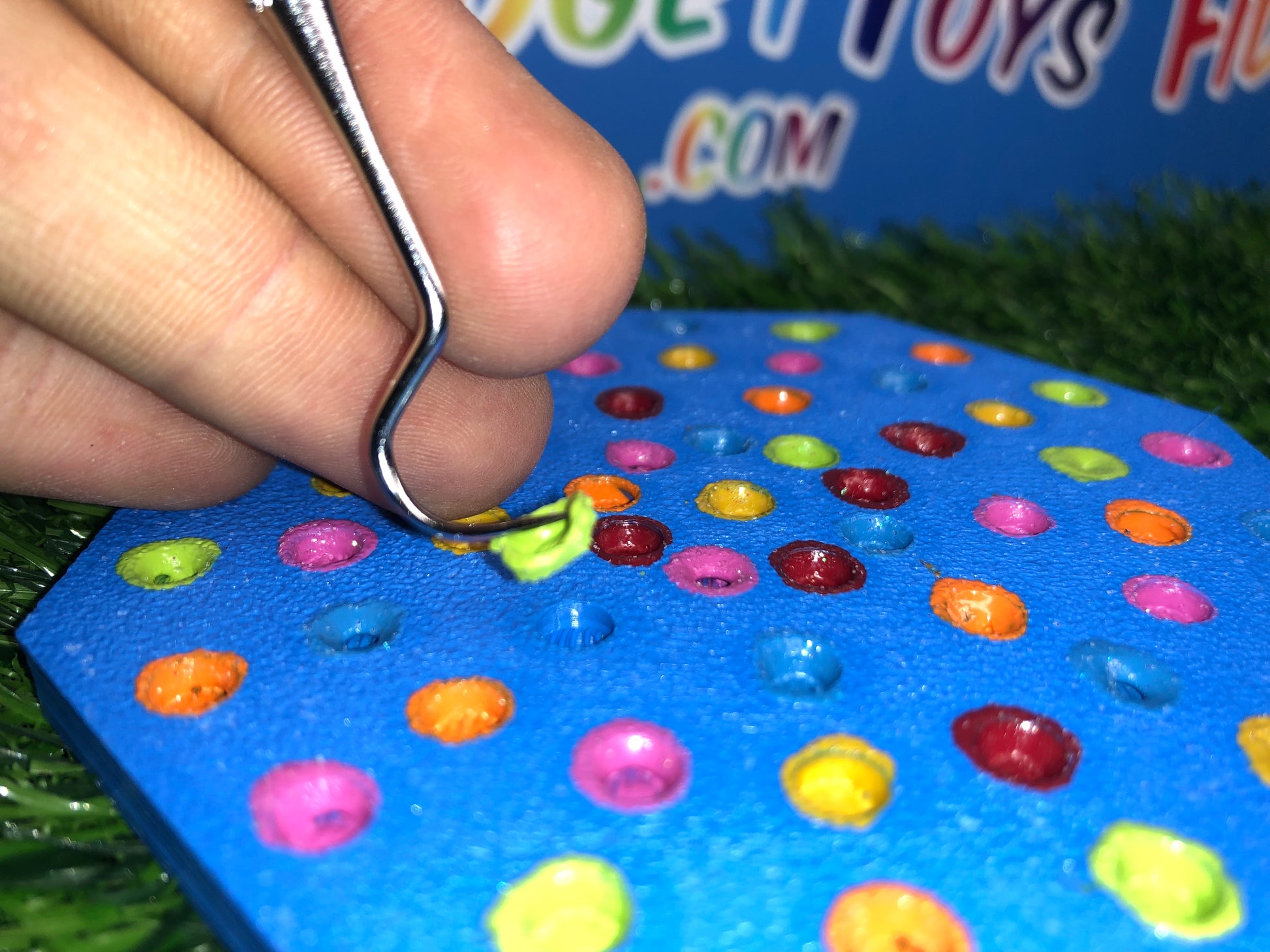 Featuring two sides for picking and peeling, the colored resin mimics stretchy rubber as you work your magic with the custom pallet. It's a tactile experience that not only relieves stress but also transports you back to the times when picking glue off your hands was the highlight of your day.